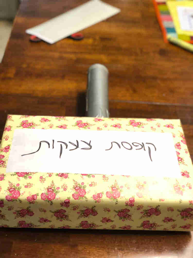 6. עוטפים את הקופסה בנייר עטיפה צבעוני או בנייר מדפסת ועליו אפשר לצייר, להדביק קישוטים וכו'